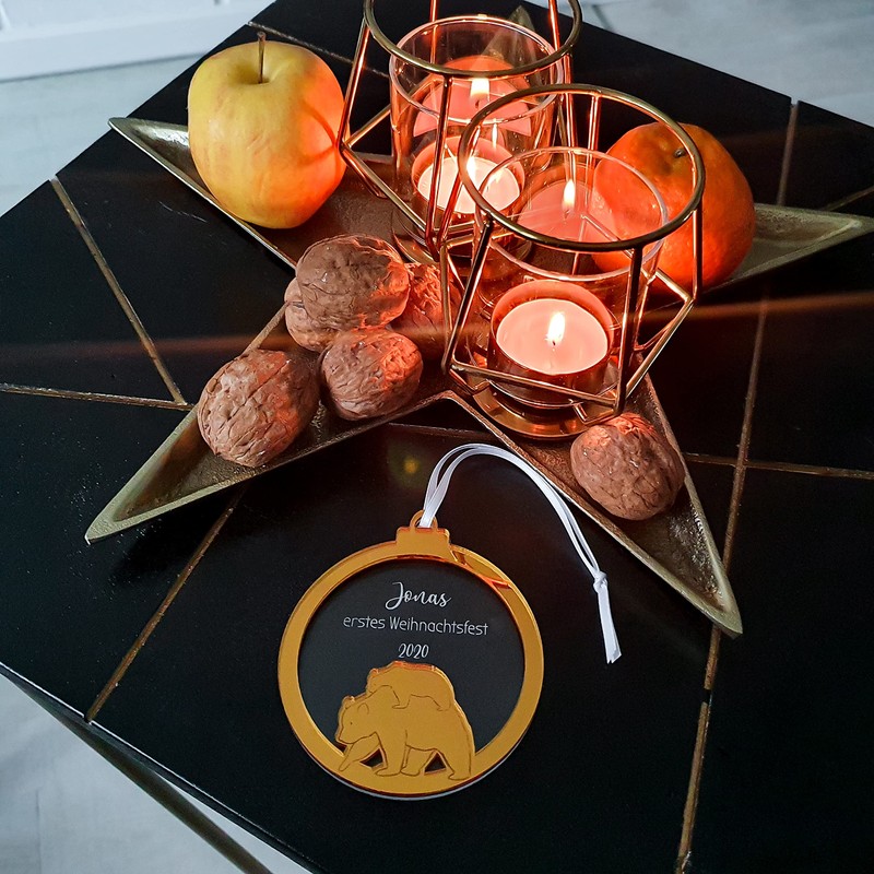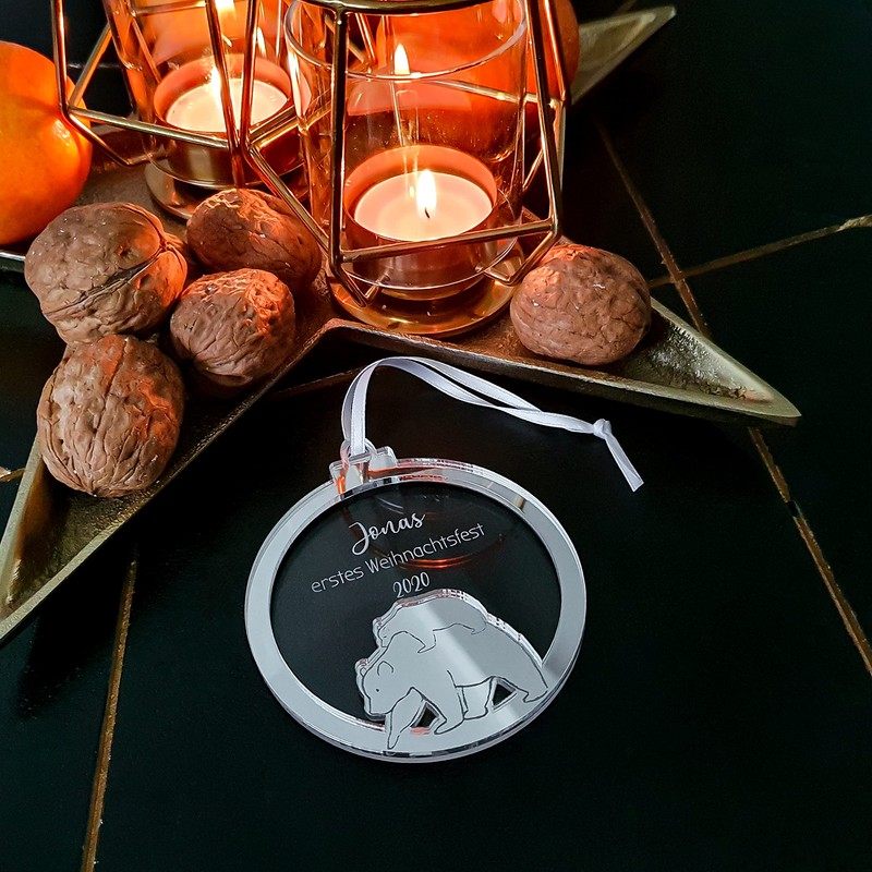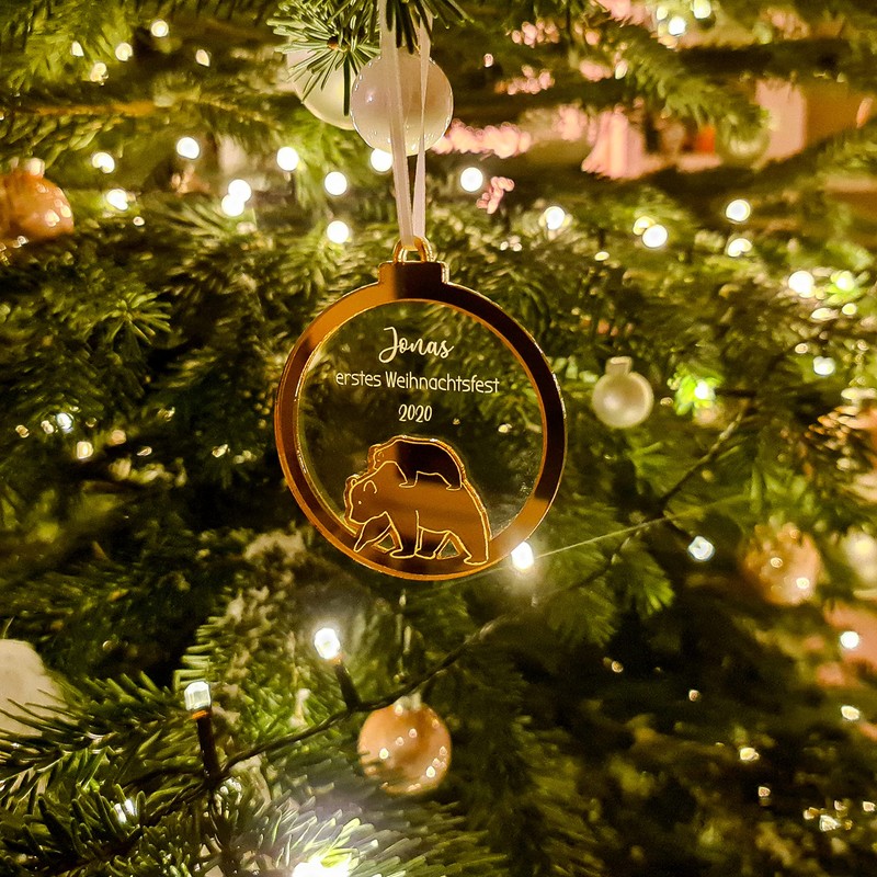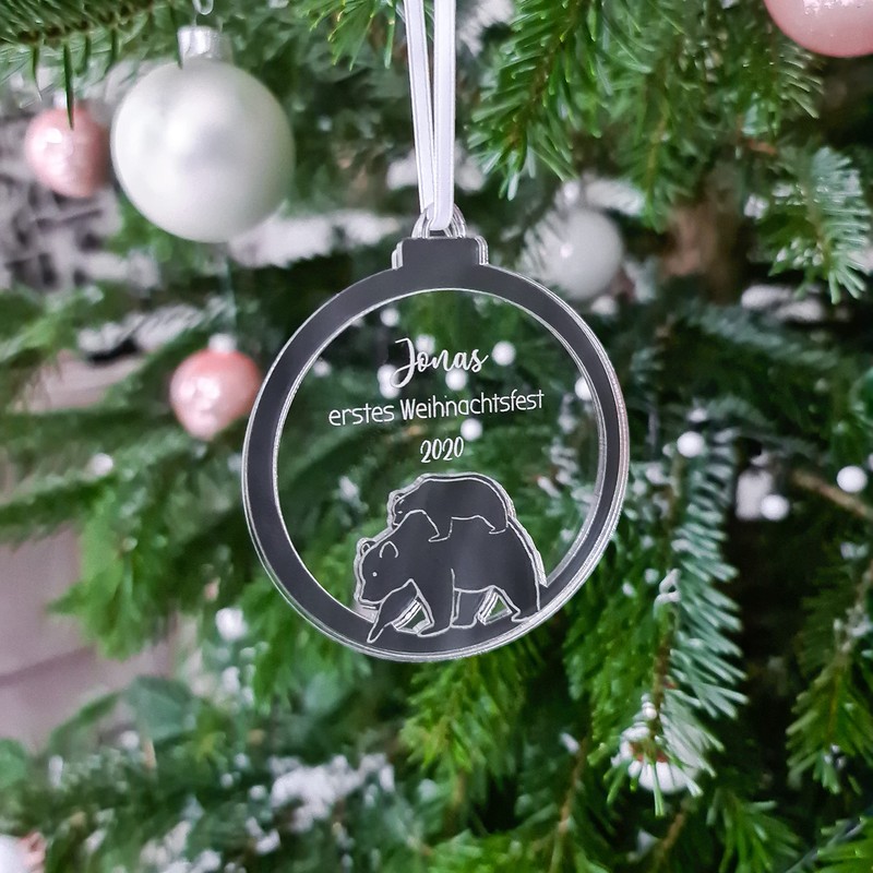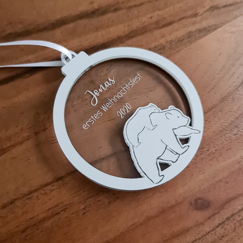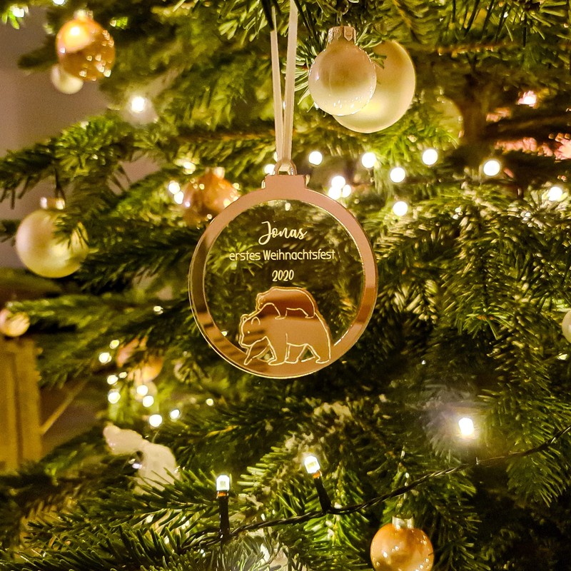 Der Anhänger besteht aus zwei Schichten, was dem Ornament einen schönen 3D-Effekt verleiht. Auf der hinteren Schicht aus klarem Acryl-Glas befindet sich die Individualisierung mit dem Namen des Babys und dem Jahr des ersten gemeinsamen Weihnachtsfestes. Auf der vorderen Schicht ist ein Bär mit Baby in das gold- bzw. silber-farbene Acryl graviert. Der Baumschmuck kann jedes Weihachten wieder an den Weihnachtsbaum gehängt werden und ist eine schöne Erinnerung für die ganze Familie. Der Anhänger ist übrigens auch für Mädchen mit Rehkitz-Motiv in unserem Shop erhältlich.