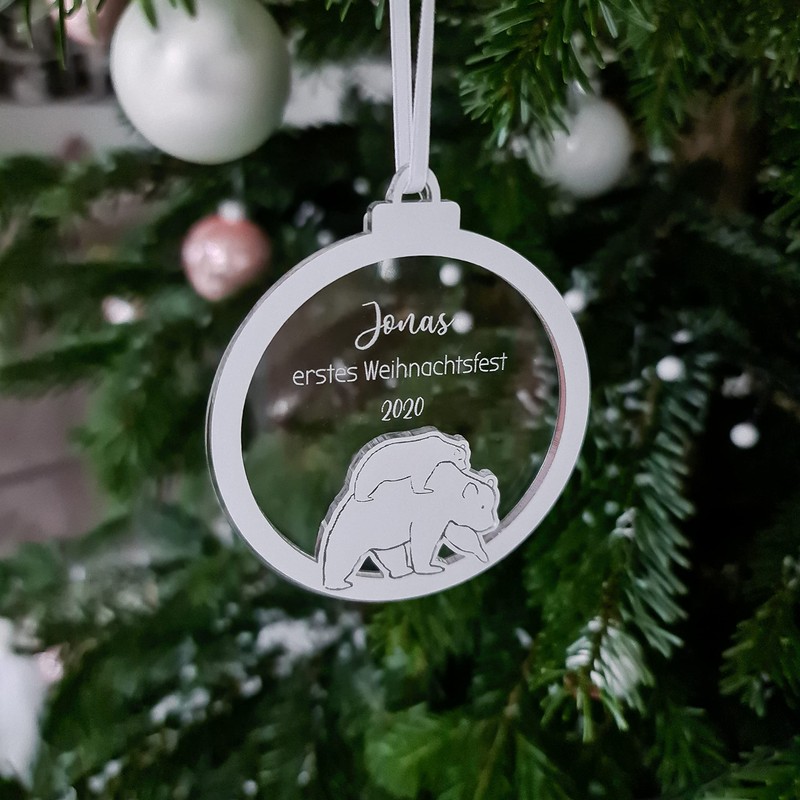 Der Anhänger besteht aus zwei Schichten, was dem Ornament einen schönen 3D-Effekt verleiht. Auf der hinteren Schicht aus klarem Acryl-Glas befindet sich die Individualisierung mit dem Namen des Babys und dem Jahr des ersten gemeinsamen Weihnachtsfestes. Auf der vorderen Schicht ist ein Bär mit Baby in das gold- bzw. silber-farbene Acryl graviert. Der Baumschmuck kann jedes Weihachten wieder an den Weihnachtsbaum gehängt werden und ist eine schöne Erinnerung für die ganze Familie. Der Anhänger ist übrigens auch für Mädchen mit Rehkitz-Motiv in unserem Shop erhältlich.