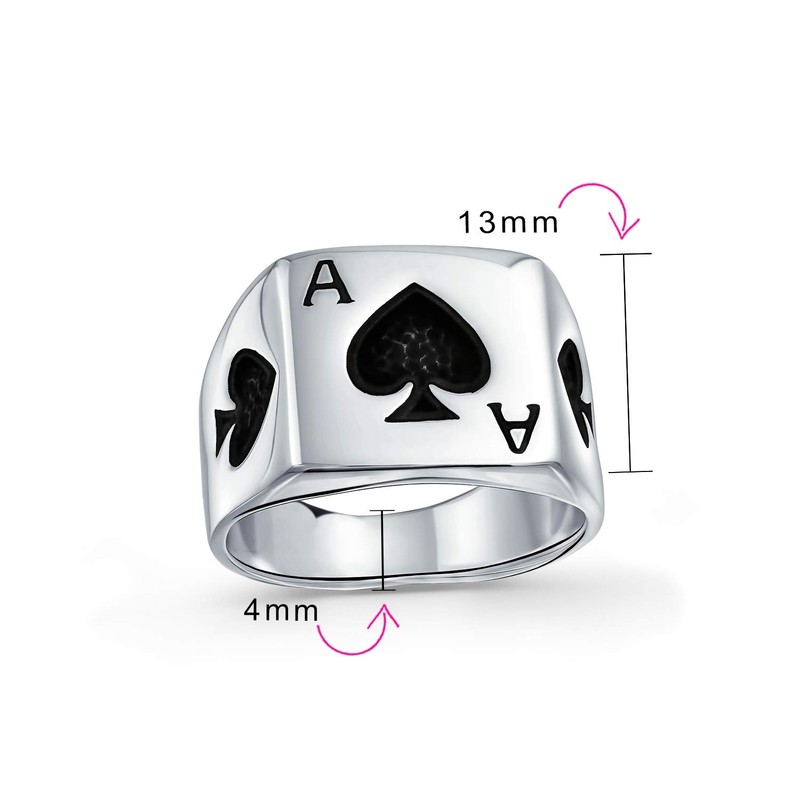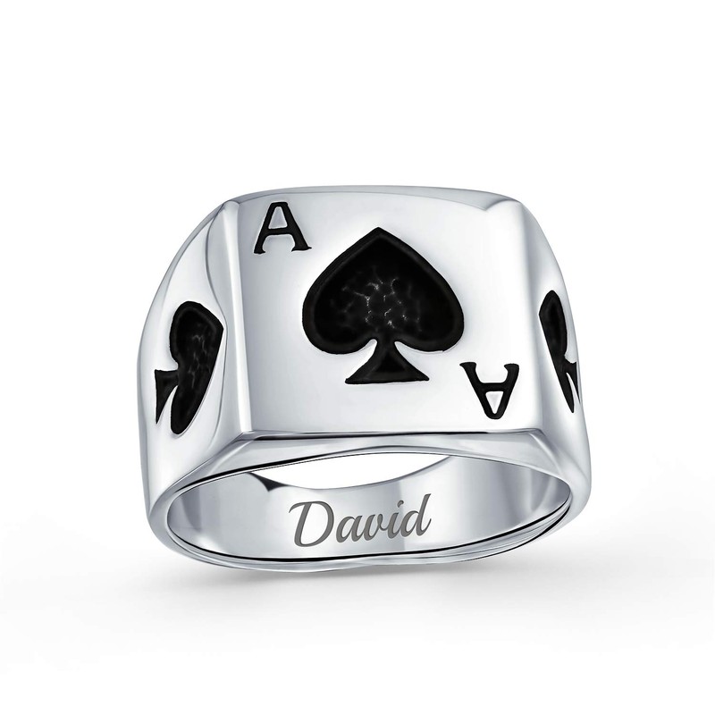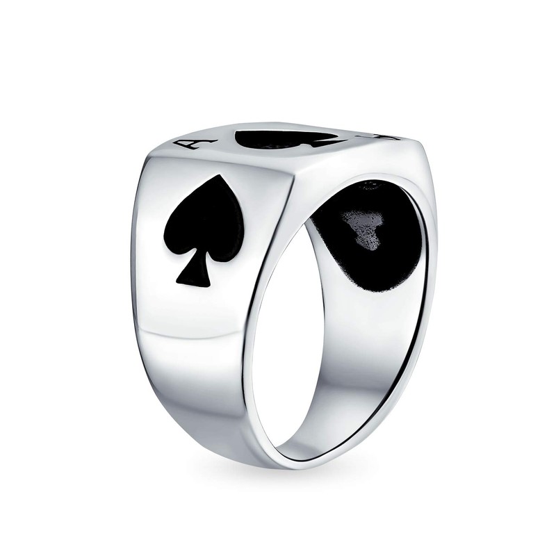 - Place your bets on how much your guy will love these playing card ring. Featuring ace of spades. Silver accented with black detailing to highlight the ace card symbol. If Las Vegas or Atlantic City are popular destinations for gambling the man in your life will adore these and bring you home his winning and maybe a diamond. Whether you are playing poker for fun, or you happen to be a serious high roller, who casinos love to comp, with mans ring, you are already a winner.