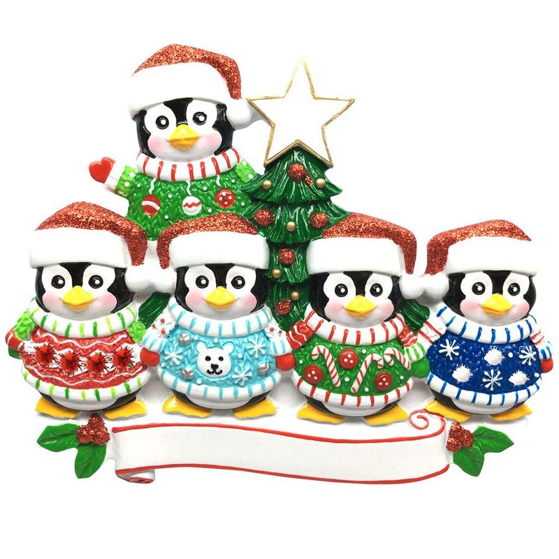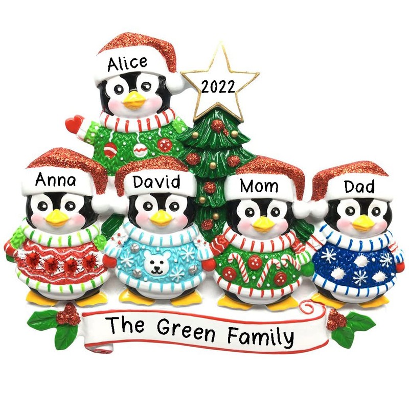 Personalized Festive Ugly Christmas Sweater Penguin Family Christmas Ornament-Free Personalized (Family of 5)