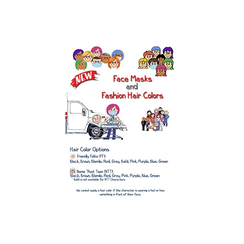 â ¿ Most ADULT characters can have a hair style, glasses or sunglasses &/or a mask added. Hair color is available in black, brown, blonde, red, grey and bald. Please see graphic for details.