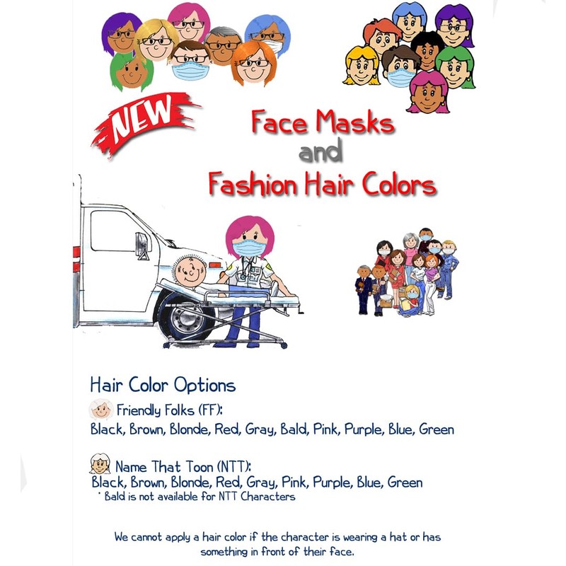 â ¿ Most ADULT characters can have a hair style, glasses or sunglasses &/or a mask added. Hair color is available in black, brown, blonde, red, grey and bald. Please see graphic for details.