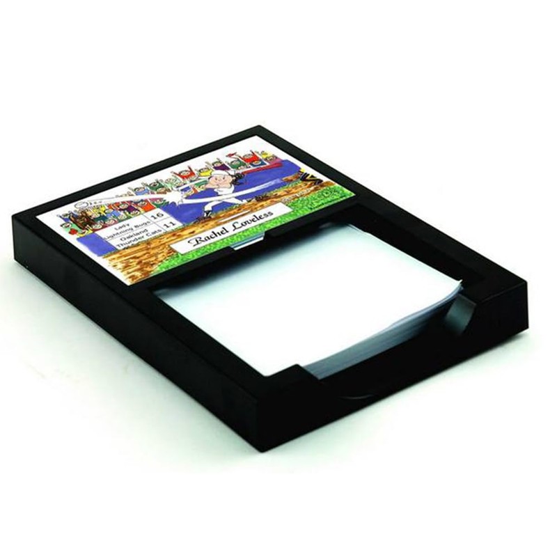 Looks great and is useful on a desk, as well as a kitchen counter! Made of durable black plastic, this memo pad holder is complete with 100 sheets of standard 4â x 6â paper. Paper refills are available through Printed Perfection or any office supply.