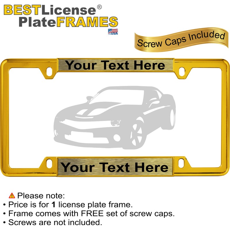 - PREMIUM QUALITY - Our Best-selling Thin Top Standard Size - USA and Canada Automobile Custom 4-hole Gold Metal License Plate Frames are made to fit 12" x 6" Car license plates. Each frame has 4 mounting holes and 2 securing tabs on the back side of it to keep your license plate in place and prevent it from rattling. This Metal(Zinc) Gold-Plated license plate frame is Very Durable, UV stable and made to last. It will not break at the car wash and withstand any weather conditions.