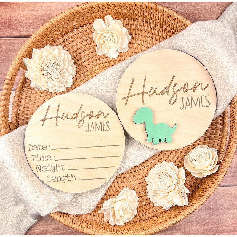 Personalized Wooden Birth Announcement Sign, Custom Baby Name Sign with Dinosaur, Engraved Newborn Stats Board, Nursery Decor (Double Sided)