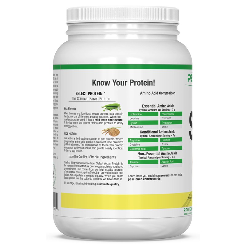 - Premium pea and brown rice protein blend; Select Vegan is a complete protein with a full amino acid profile