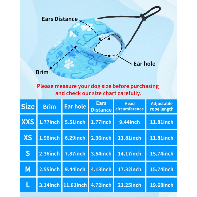 - Size: The small dog sun hat has 5 sizes(XXS/XS/S/M/L) to choose from, suitable for most small, medium and large types of dogs, cats, and rabbits. NOTE: L size is not suitable for all large breeds, please choose according to the measured size especially the head circumference. Besides, the baseball cap with chin strap can be adjusted, it works well to keep hats in place against wind when pet play outside. If the rope is too long for your furry baby, you can tie a bow, which is also very cute