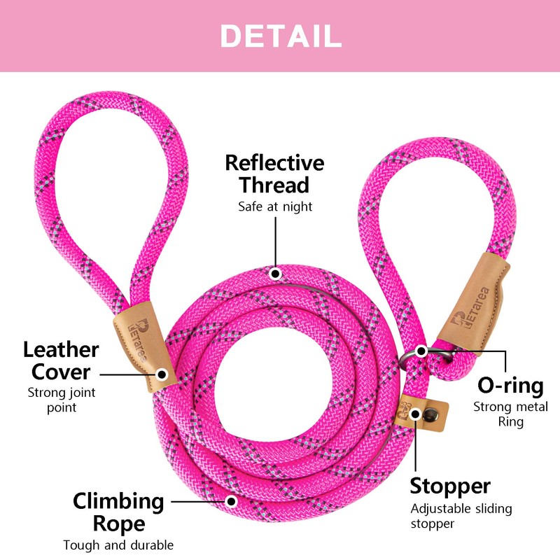 • DURABLE LEASH - The leash is made of heavy-duty mountain climbing rope, and the woven polyester material provides maximum durability, making it able to sustain even the strongest pulling. The use of high quality metal O-ring and leather enhances the durability.