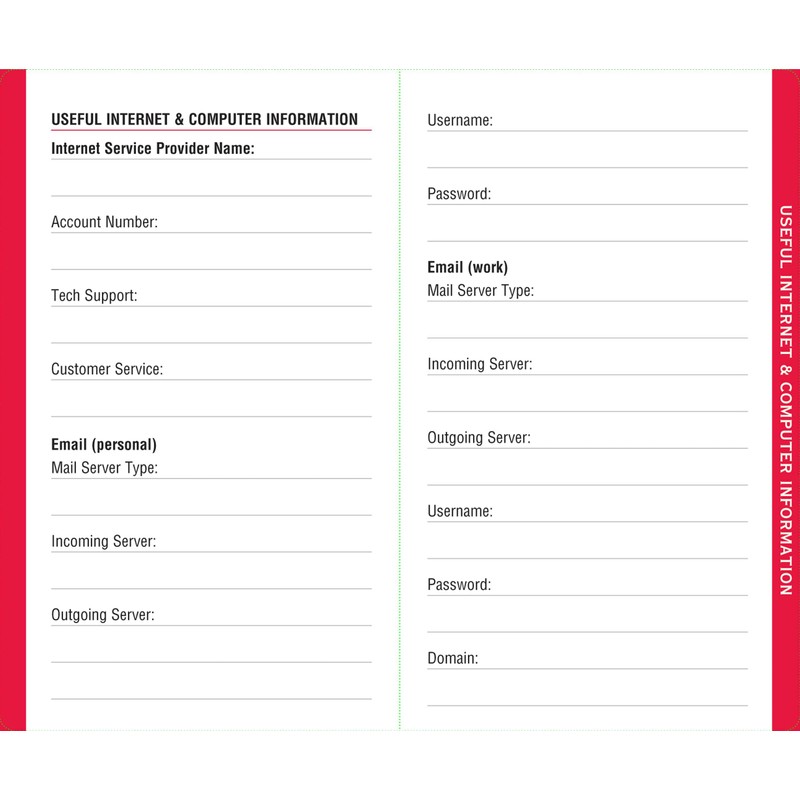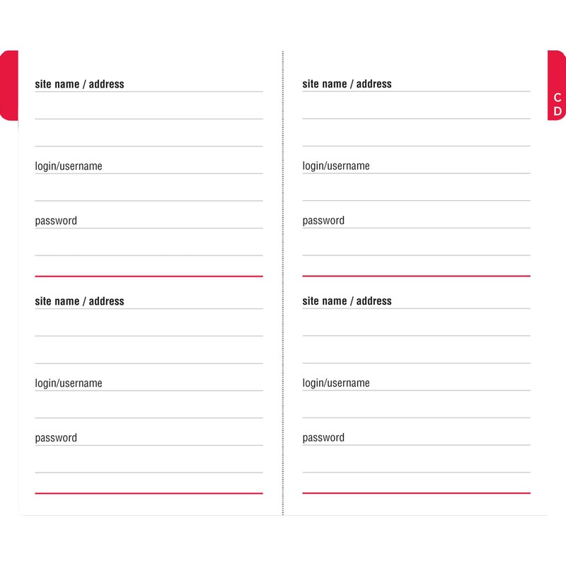 - Tabbed alphabetical pages that provide space for noting website addresses, usernames, passwords, and extra details.