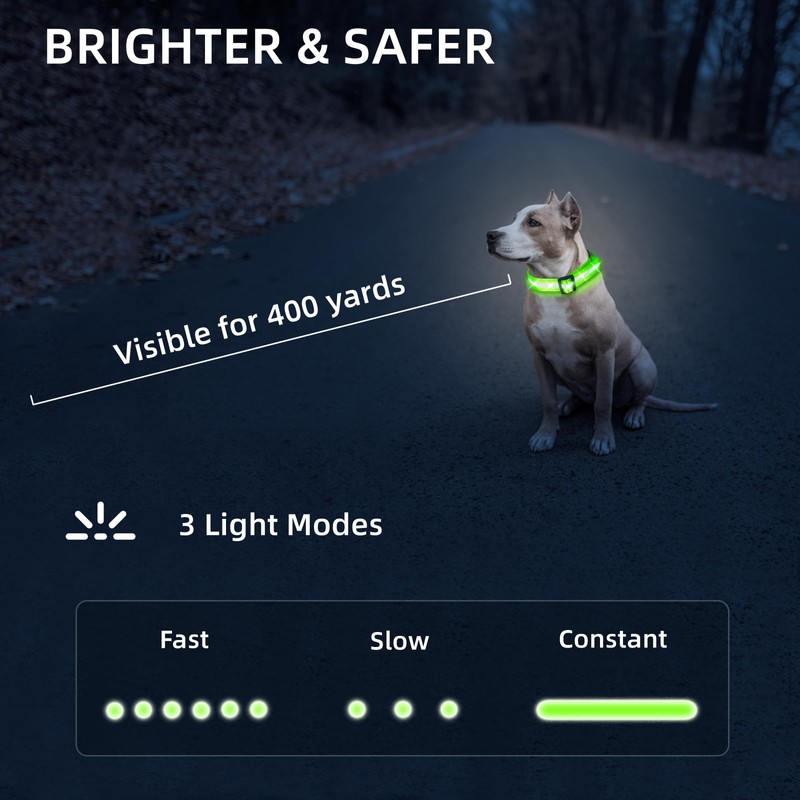 - Enhanced Visibility: Illuminate your dog with three vivid LED flashing modes—fast, slow and constant—ensuring maximum visibility and safety during nighttime walks.