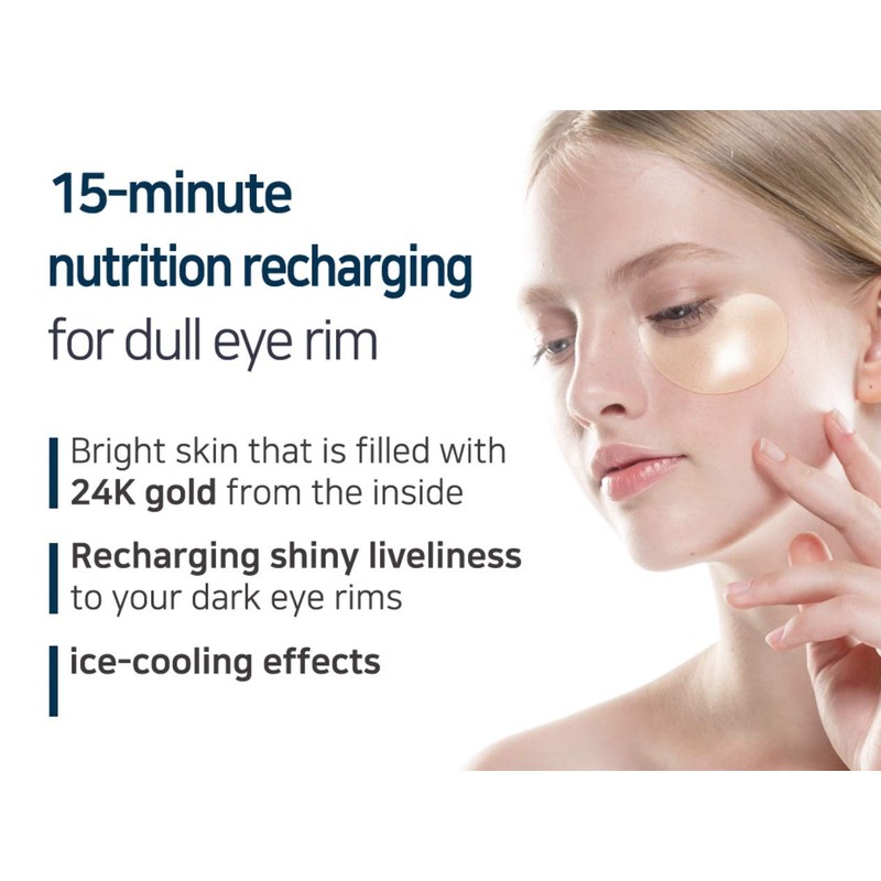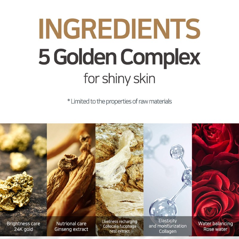 FEATURES Containing effective ingredients such as Gold, Ginseng [5,000 ppm], Bird's Nest, Collagen and Rose Flower Water helps make skin around eyes glowing and moisturized. INGREDIENTS Water, Glycerin, Calcium Chloride, Chondrus Crispus Powder, Methylpropanediol, Ceratonia Siliqua Gum, Xanthan Gum, Hydroxyethylcellulose, Peg-60 Hydrogenated Castor Oil, Panax Ginseng Root Extract, Swiftlet Nest Extract, Aloe Barbadensis Leaf Extract, Sodium Hyaluronate, Betaine, Rosa Centifolia Floer Water, Hydrolyzed Collagen Gold (1 Ppm), Alcohol, Synthetic Fluorphlogopite, Titanium Dioxide, Cl 77491, Scutellaria Baicalensis Root Extract, Camellia Sinensis Leaf Extract, Houttuynia Cordata Extract, Artemisia Vulgaris Extract, Citrus Junos Fruit Extract, 1,2 - Hexanediol, Caprylyl Glycol, Citrus Grandis (Grapefruit) Seed Extract, Bambusa Textilis Stem Extract, Pinus Palustris Leaf Extract, Ethyl Hexandiol, Disodium Edta, Mineral Oil, Methylparaben, Chlorphenesin, Phenoxyethanol, Fragrance. DIRECTIONS Smooth your skin texture after washing and place the patch onto the skin area using a spatula. Peel off the patch after 20-30 minutes and gently tap remaining essence into the skin.