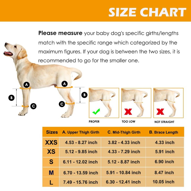 - PORTABLE AND FLEXIBLE TO USE: The dog knee brace comes with an adjustable connecting strap which makes it difficult to slip off your pet. This canine knee brace could be used for any specific leg of the four ones,again,you need to refer to the SIZE CHART before choosing the right one since the dimension usually varies among them.