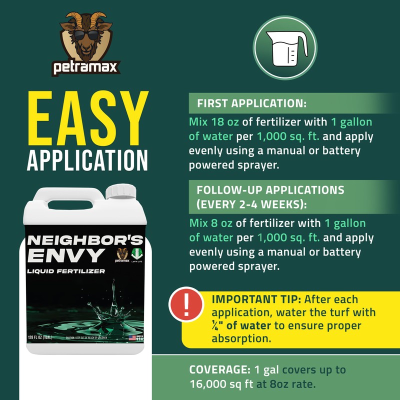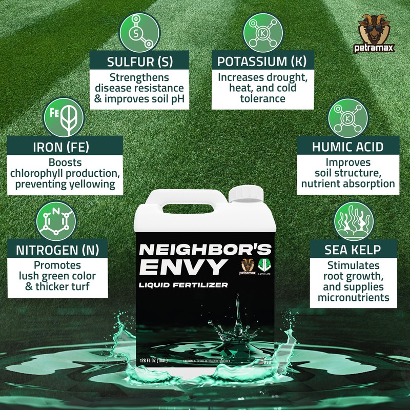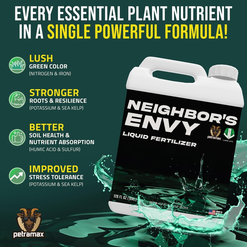 PetraMax Neighbor’s Envy Grass Fertilizer for Lawn & Garden, 1 Gallon Covers up to 16,000 sq.ft. 7-in-1 Liquid Lawn Fertilizer Concentrate for Deep Green Turf - Includes Nitrogen/Iron/Humic/Sea Kelp