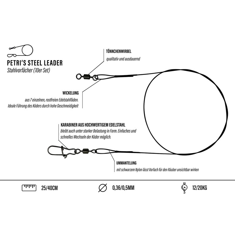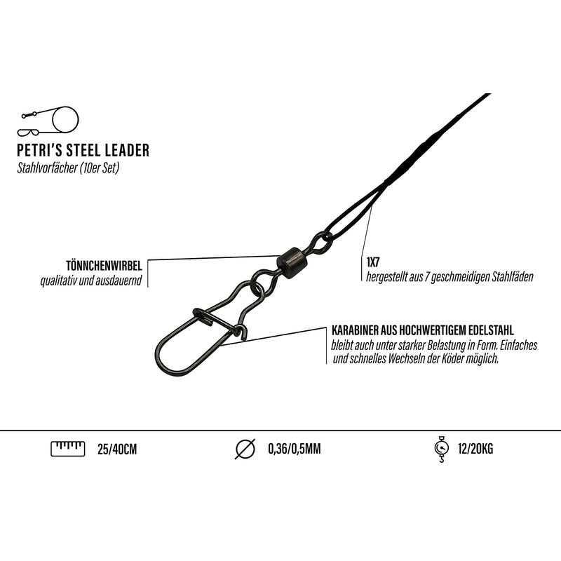The Petris Steel Leader steel leaders in lengths of 25 cm or 40 cm impress with their high-quality workmanship and sturdy construction. Particular attention was paid to the use of high-quality carabiners and swivels.