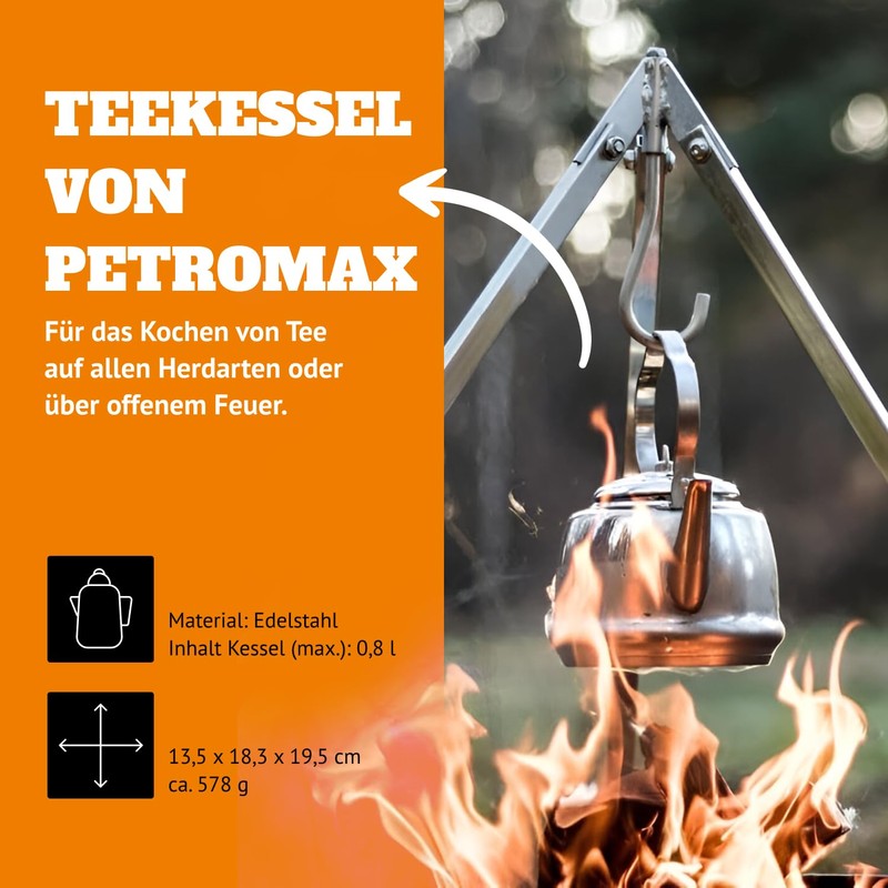 - Box contents: 1 x Petromax stainless steel tea kettle 1.5 litres, base diameter 13.5 x height 15 cm, 630 g