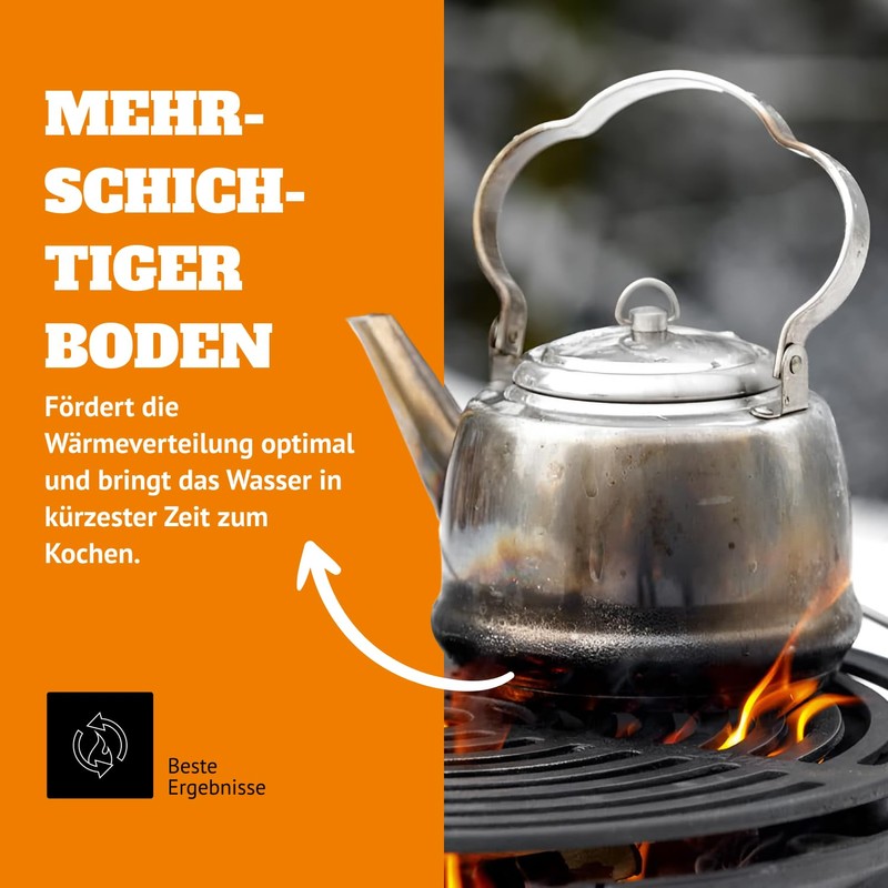 - Water is heated quickly and easily - on an open fire as well as on an electric, gas or induction stove. The triple arc-shaped, movable handle allows hanging over the fire and allows for comfortable handling