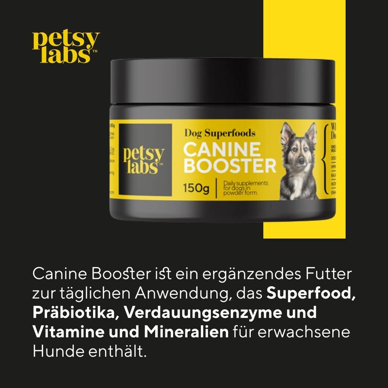 - ✔️A mix of the best ingredients for your dog. Canine Booster is a complementary daily feed that contains superfood, prebiotics, digestive enzymes and vitamins and minerals for adult dogs.