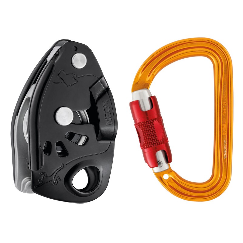 PETZL NEOX Belay Device with Sm'D Twist-Lock Carabiner - Belay Device with Cam-Assisted Blocking for Sport, Trad, & Top-Rope Climbing - Black