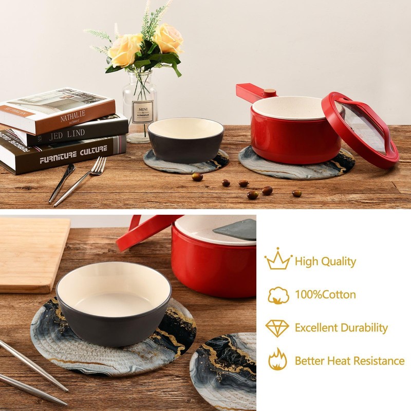 - [Quality Material] Our kitchen trivets and coasters weaved by 100% natural cotton, stronger heat resistance which will not melt, water absorption and durable, not only make your dining table, furniture and kitchen countertops keep clean, but also protect their surfaces from hot pans, pots, cast iron skillets, coffee tea pots, hot dishes