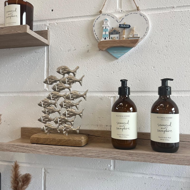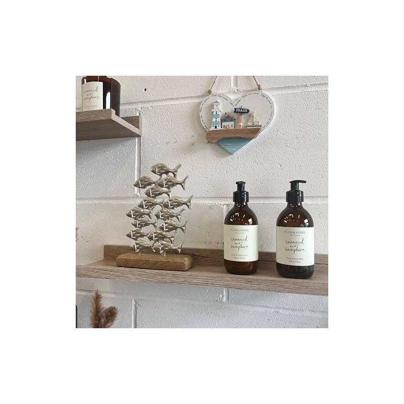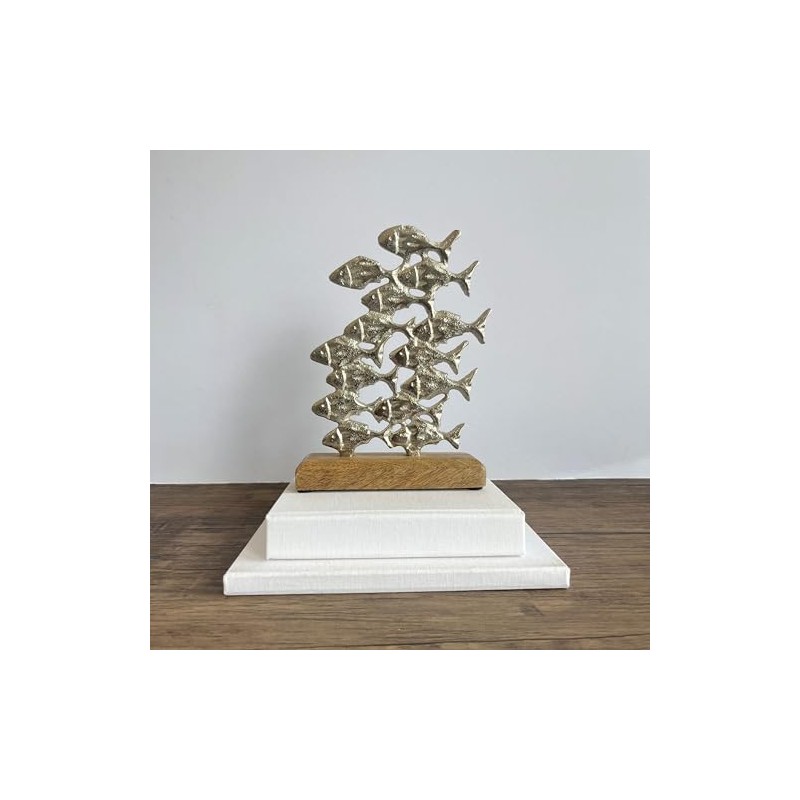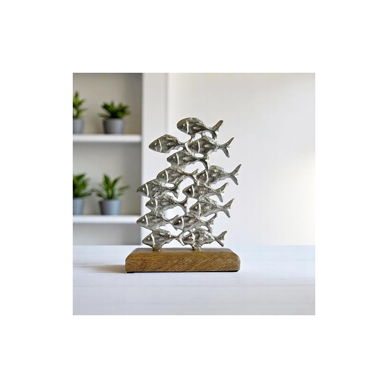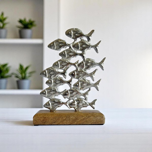 - DESIGN: Beautiful silver school of fish artistically mounted on a rustic driftwood-style wooden stand for a striking coastal aesthetic.