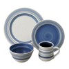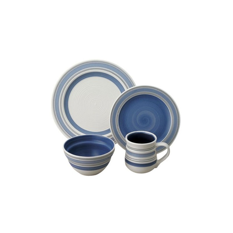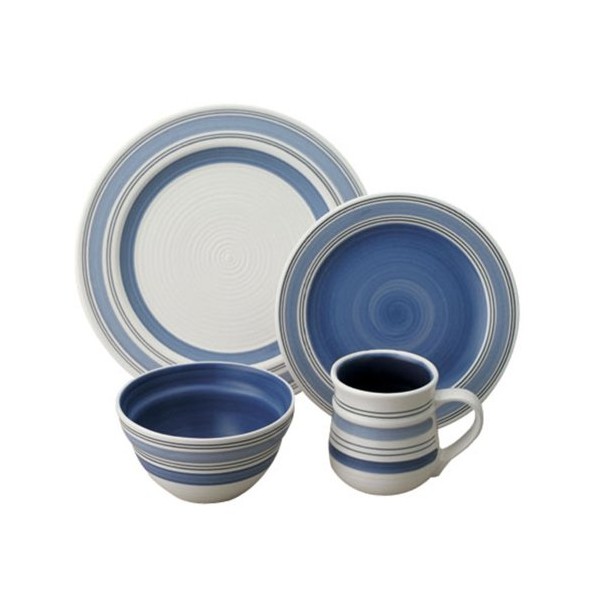 Cool and refreshing, like a dip in the pool on a hot day, Rio's circular blue- on-white patterning just makes you feel good. Mixing wide stripes with narrow, dark blue with light, a white background with solid blue-the differing stoneware pieces all combine to create a pleasing setting for casual, everyday dining. This is a pattern that also lends itself to seasonal variations. Add red table linens for a Fourth of July celebration; yellow for Easter brunch. A good selection of matching stoneware serving pieces and accessories is available, as are melamine plates and acrylic glassware for carefree, outdoor parties.