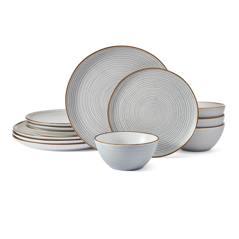 - ORGANIC APPEAL: Rowan Gray dinnerware brings earthy style to the table with concentric circles swirling around gray pieces with a warm tan rim