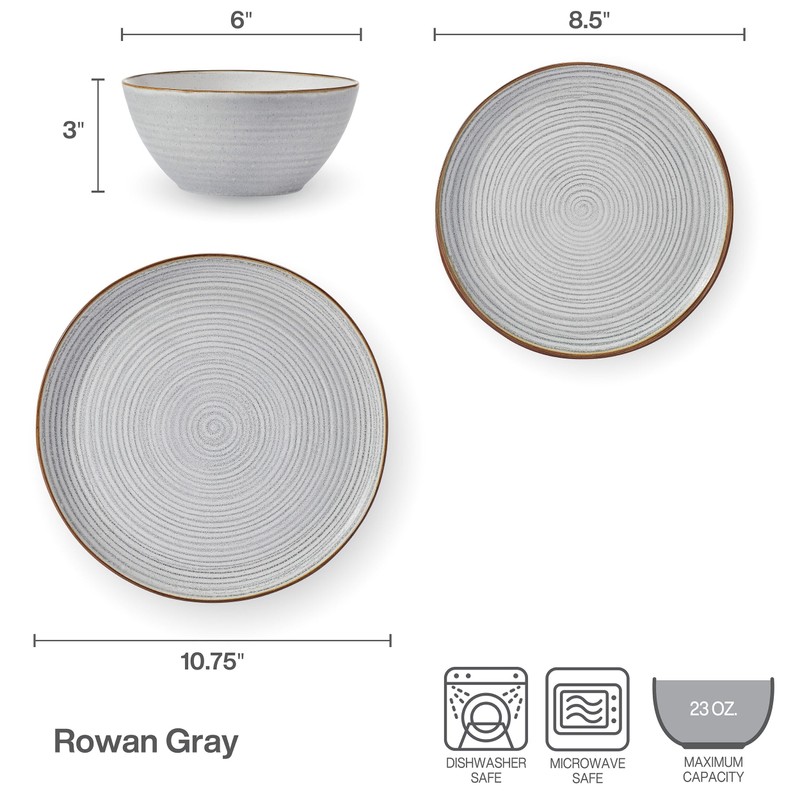 Pfaltzgraff Rowan Gray 12 Piece Plate Bowl Dinnerware Set, Service for 4
