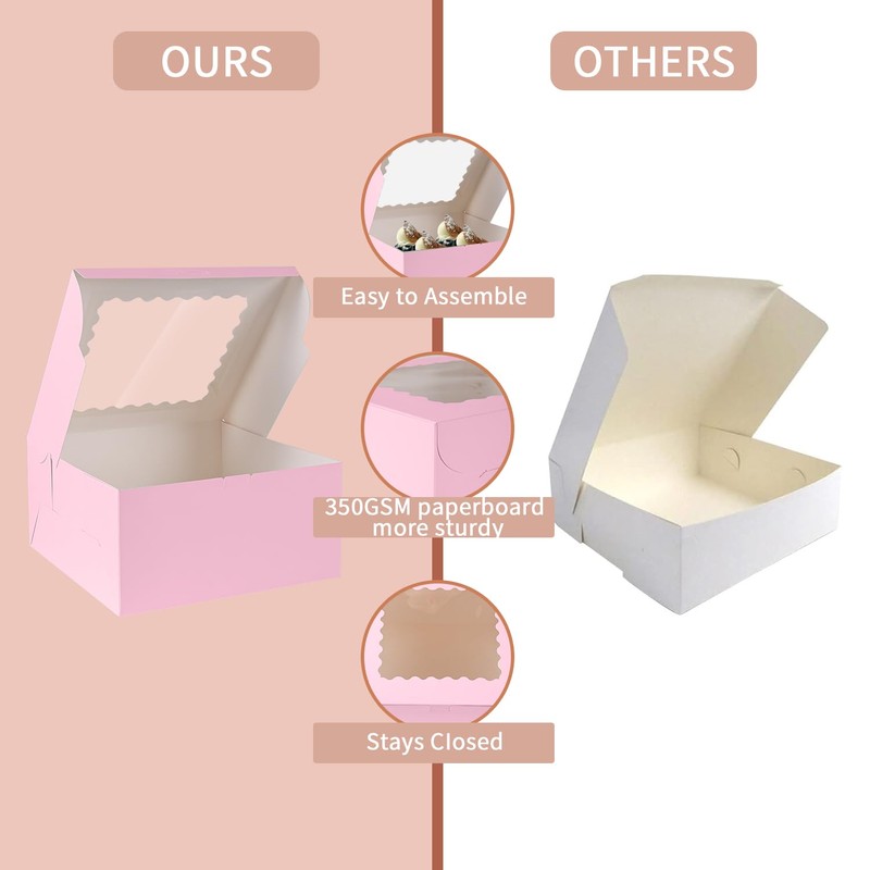 - High quality cardboard: The transparent window cake transport container is made of 350g cowhide high quality cardboard, thick texture, not easy to bend, not easy to tear, to ensure that when transporting or selling any baked goods, the box will not break or tear.
