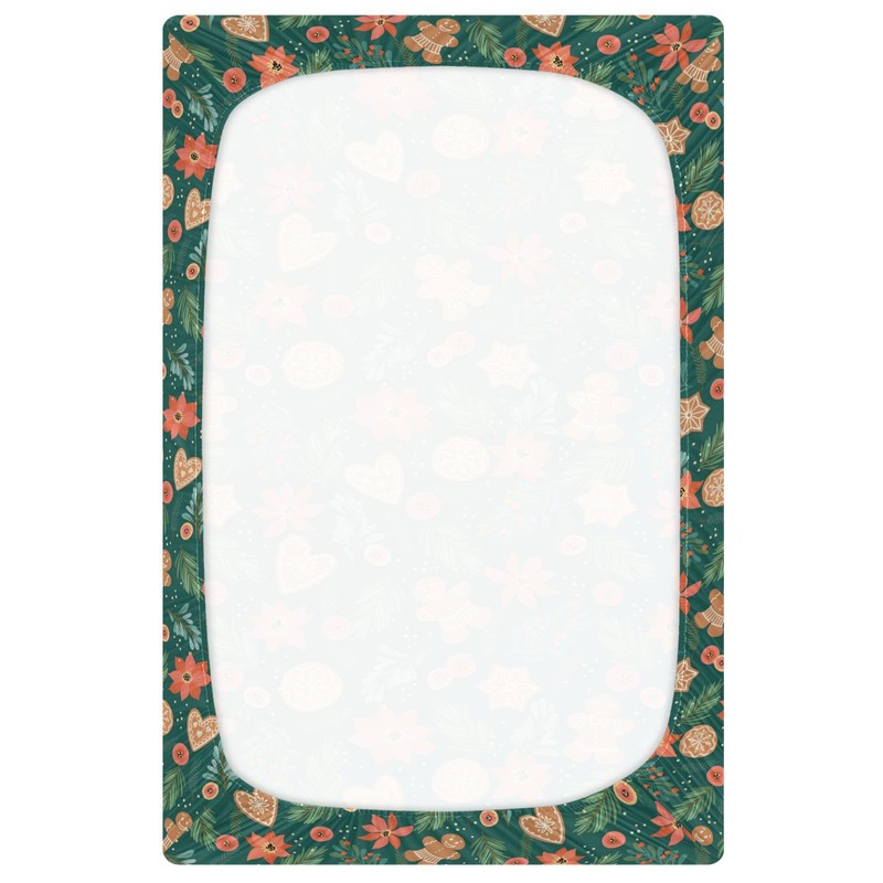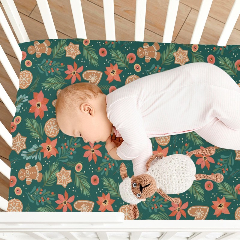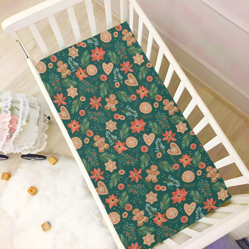 Pfrewn Christmas Crib Sheets for Boys Girls Green Christmas Poinsettia Gingerbread Fitted Crib Sheet Fits Standard Crib Mattress Pads Winter Pattern Stretch Soft Toddler Baby Sheet,52x28IN