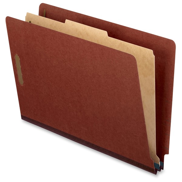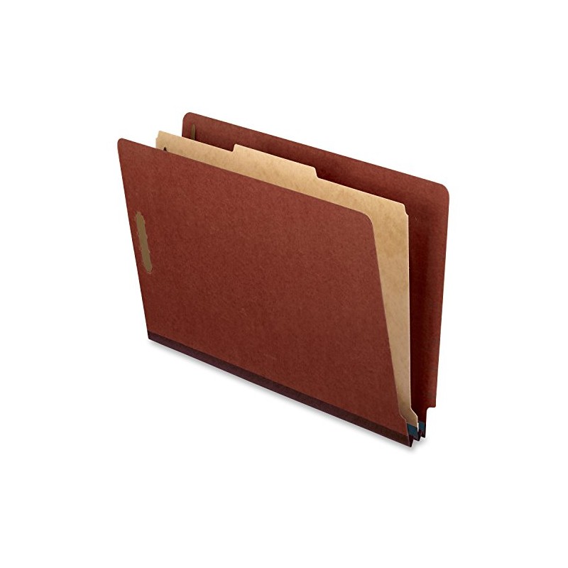 End-Tab Classification Folders offer a great way for you to subdivide within folders and keep papers in sequential order. 2" embedded fasteners (positions number 1 and 3) on sleeves and the 1" dual 17 point Kraft divider closures keep documents secure and allow you to file in sequential order. Durable, Tyvek tape expands with draft. Standard full-length end tab with an embossed score on the front cover provides room for labels or handwritten titles. Folders are made of durable, 25 point pressboard.