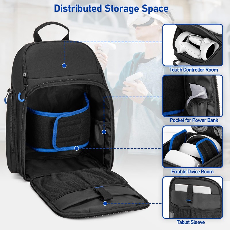 • SPECIALLY FOR: The main compartment is custom-designed for Oculus Meta Quest 2/3/Quest Pro VR headset, featuring a wide padded touch fastener to fix your VR headset in place and keep it safe; Besides, there is separate room in the top for storing touch controllers, keeping from scratches between headset and controllers