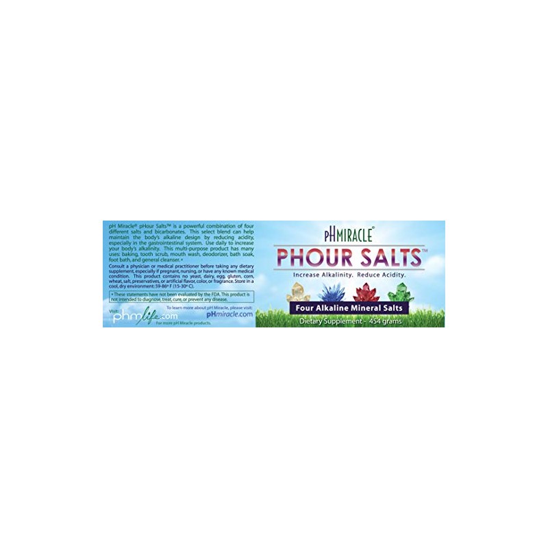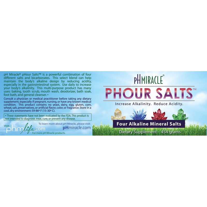 The ultimate body-alkalizing agent, pHour Salts is a combination of four powerful carbonate salts (sodium bicarbonate, magnesium carbonate, potassium bicarbonate, and calcium carbonate) that help maintain the alkaline design of the human organism. These salts are naturally occurring in all fluids of the body. Specifically, they can aid in the reduction of acidity in the lymphatic, circulatory, and gastro-intestinal systems. pHour Salts may be used daily to increase the alkalinity of any food or drink.