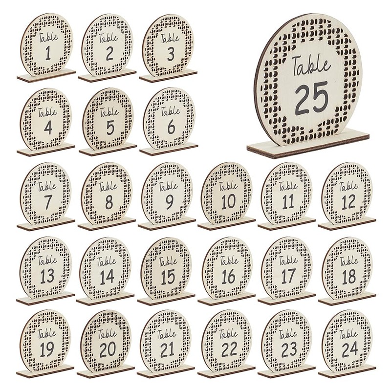 - Package Includes: 25 sets of single-sided floral white color wooden table number(1-25) with bases. Size: about 10.5x3.4x10.7 cm/ 4.1x1.3x4.2 inch; card: about 10.5x11 cm/ 4.1x4.3 inch, 5mm thick; base: about 10x3.4 cm/ 4x1.3 inch, 4mm thick. Perfect for organizing seat arrangements
