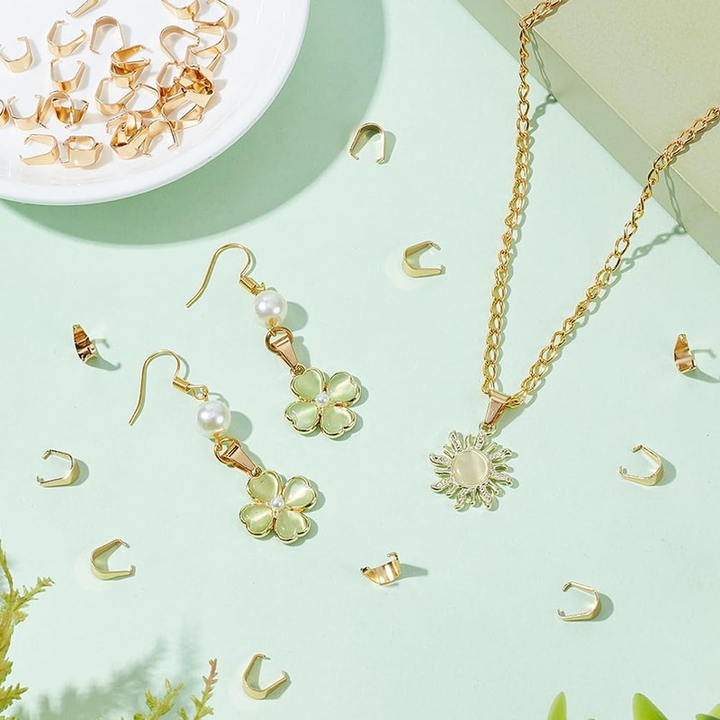 - Size Info: our golden snap on bails are about 7mm wide, 8.5mm long, 4mm thick, inner high: 7mm, 50pcs bails in total, adequate for yor DIY jewelry making projects, great for attaching beads, crystals, gemstones and some other pendants.