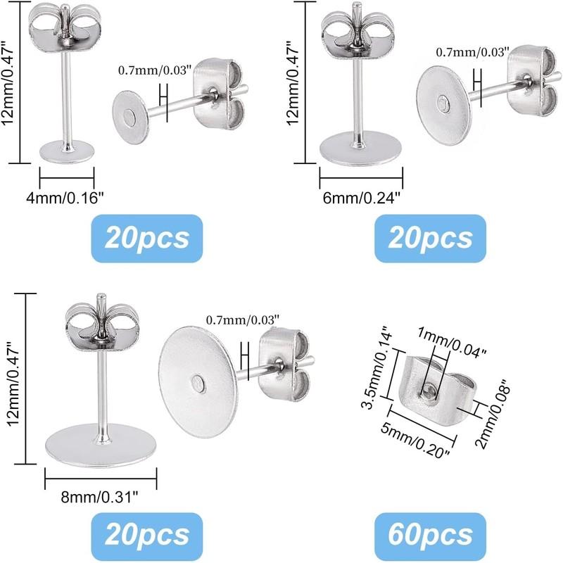 - Package includes: 60 Pieces blank earring pins( 20 pieces each size ) and 60 Pieces earrings stoppers, 60 sets in total, large quantity to meet your DIY craft and replacement needs