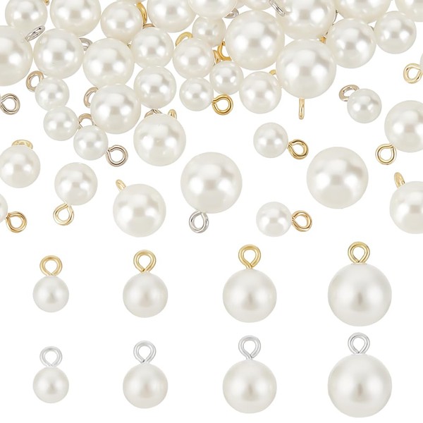 PH PandaHall Pack of 80 Pearl Pendants in 4 Sizes 8 10 12 14 mm White Pearls Round Faux Pearls with Golden/Silver Bow for DIY Earrings Necklaces Bracelets Jewellery Key Chain, Plastic, No Gemstone