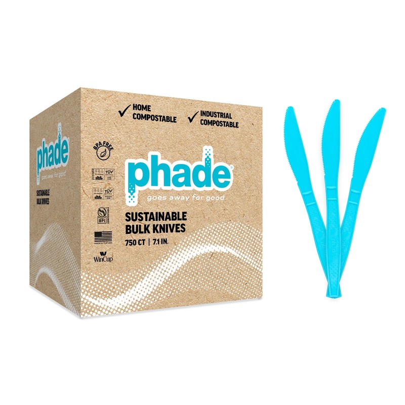Choose the smarter, sustainable solution with phade 100% Compostable Knives. Made from PHA—a cutting-edge, plant-based material developed in the USA—these knives are BPI certified and fully compostable in both home and industrial compost systems. Unlike conventional plastics or even PLA alternatives, phade knives are engineered to break down naturally within months, not centuries, while still offering the reliable performance you expect from everyday cutlery. This 750-count bulk pack of unwrapped 7.1-inch knives is perfect for a wide range of uses, from family dinners and food trucks to corporate events and catering services. Designed for strength, comfort, and clean cuts, phade knives hold up to hot foods and heavy-duty meals without bending or snapping. With no individual wrappers, they reduce packaging waste while maximizing convenience for high-volume needs. Made proudly in the USA, phade is the first brand to bring PHA-based compostable cutlery to market, setting a new standard for environmentally responsible foodservice solutions. Whether you're looking to reduce plastic waste at home or lead a greener business model, these compostable knives help you make a powerful impact—one meal at a time.