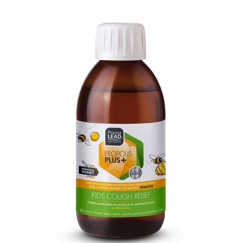 Children's herbal syrup for cough & sore throat. With Manuka Honey and Probiotics Dietary supplement with Propolis & Manuka Honey, Thyme, Ivy, Eucalyptus, Vitamin C, Zinc & Probiotics. Cherry flavored 0% ALCOHOL | GLUTEN | LACTOSE | PIGMENTS With organic cane & stevia sugars.