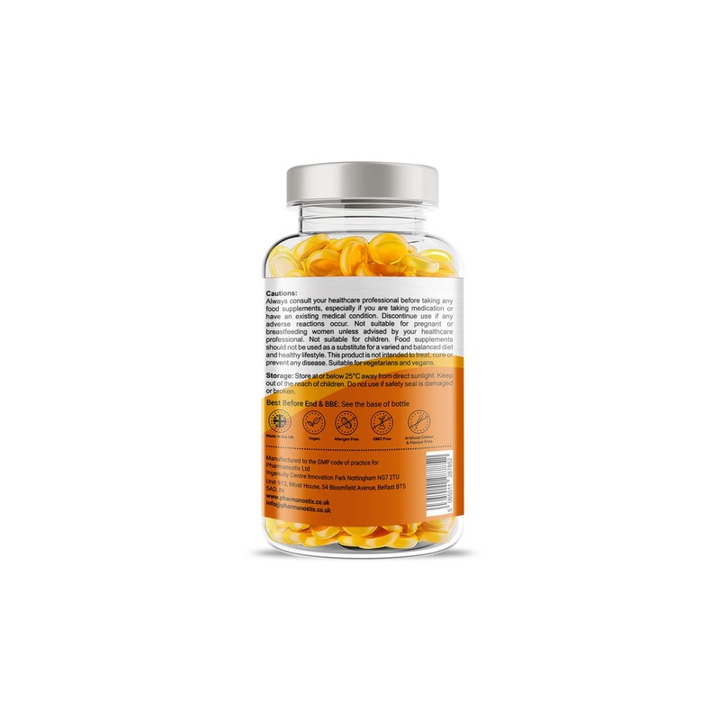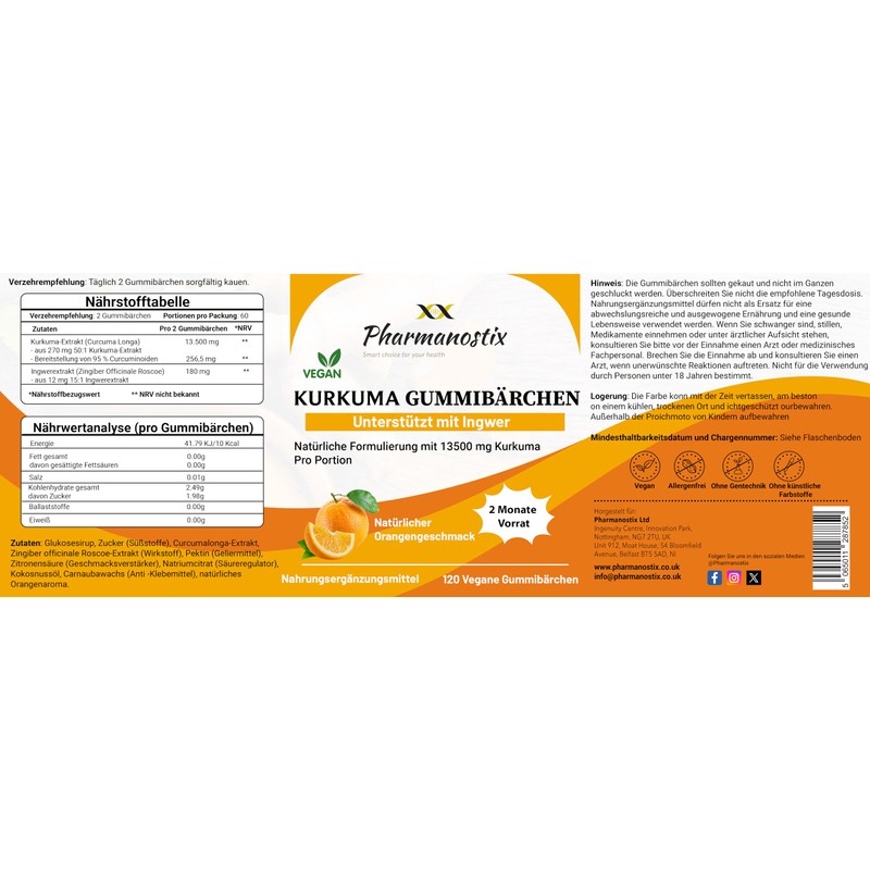 Product descriptionPharmanostix Turmeric Curcumin with Ginger Vegan Gummies offer a delightful and convenient way to incorporate the benefits of turmeric into your daily routine. These natural orange-flavoured gummies are a delicious treat packed with 13,500mg of turmeric per daily serving. Crafted with vegan-friendly ingredients, these high-strength gummies are perfect for adults seeking a tasty supplement. Enjoy the synergistic combination of turmeric and ginger, known for their potential health-promoting properties. Indulge in a guilt-free snack that supports your well-being while satisfying your taste buds.IngredientsGlucose Syrup, Sugar (Sweeteners), Curcuma longa extract, Zingiber officinale Roscoe extract (Active ingredient), Pectin (Gelling Agent), Citric Acid (Flavour enhancer), Sodium Citrate (Acidity Regulator), Coconut Oil, Carnauba Wax (Anti-sticking agents), Orange natural flavouring.DirectionsAdults take two (2) gummies daily. Gummies should be chewed and not swallowed. Do not exceed the stated dose.