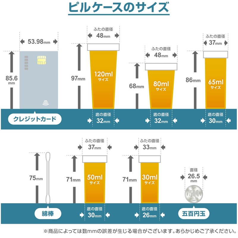 - (Available in a variety of sizes to suit your needs) From the 4.2 fl oz (120 ml) size recommended for storing larger capsules and pills such as fish oil and multitamins, to small sizes (1.0 fl oz (30 ml), and 50 ml) for easy carrying. The small size fits perfectly inside your pocket or bag, and is recommended for commuting to work or school, as well as for travel and outdoor activities