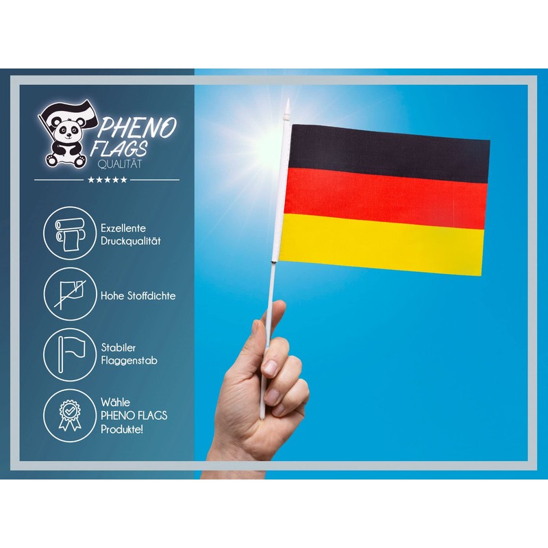 PHENO FLAGS Germany Hand Flag, Set of 10 - Small Germany Flags for Football Games and Fan Events - 12 x 20 cm Hand Flags with 30 cm Flag Rod - 75D Polyester Fabric