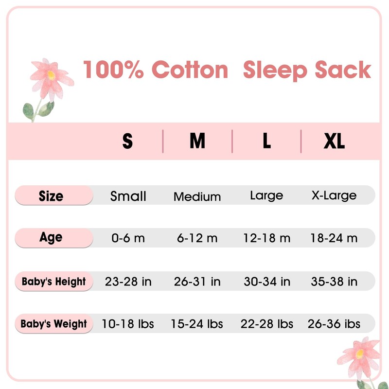 - 4 Size Options: The sleep sacks are a must-have for your baby's everyday routine,it will provide optimal comfort for undisturbed sleep.There are 4 sizes available for your choices. Small for 0-6 months, Medium for 6-12 months, Large for 12-18 months, and X-Large for 18-24 months.