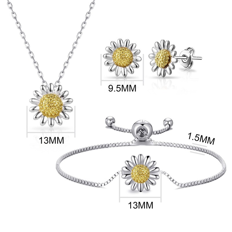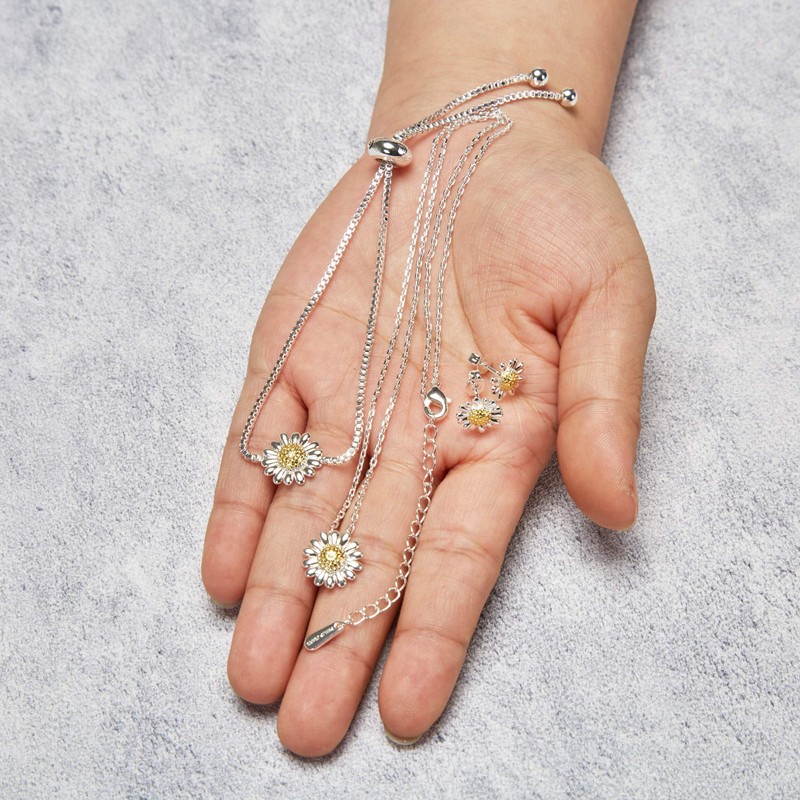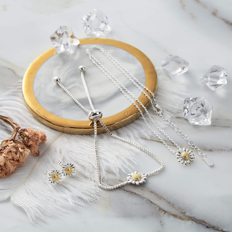Add a touch of elegance to your look with this 3pc Daisy Set from Philip Jones. Crafted from brass alloy, this set features a stud earring, a pendant necklace and a friendship bracelet, each plated in gold and silver. The bracelet is embellished with Zircondia crystals for a sparkly finish. The total weight is 10.7g.