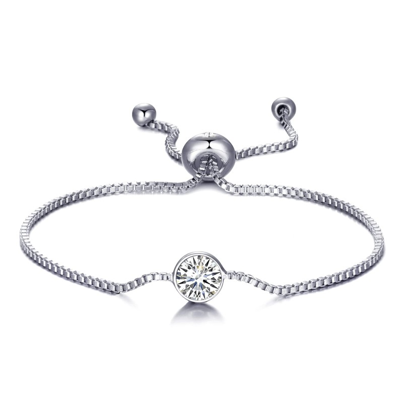 This Crystal Bracelet from Philip Jones is crafted from Silver Plated Brass Alloy, featuring two round crystals from Zircondia - an 8.5mm "hero" crystal and 1.5mm accent stones. This adjustable bracelet ranges from 12cm to 24cm and weighs in at 5.5g. Add a sparkle of sophistication to any look.
