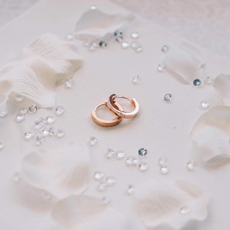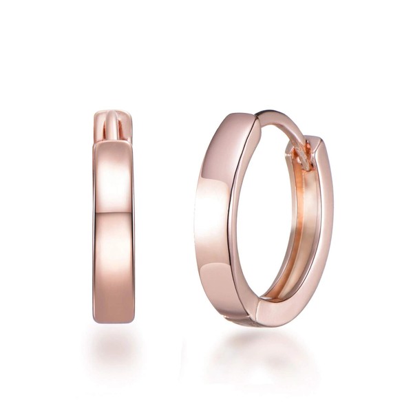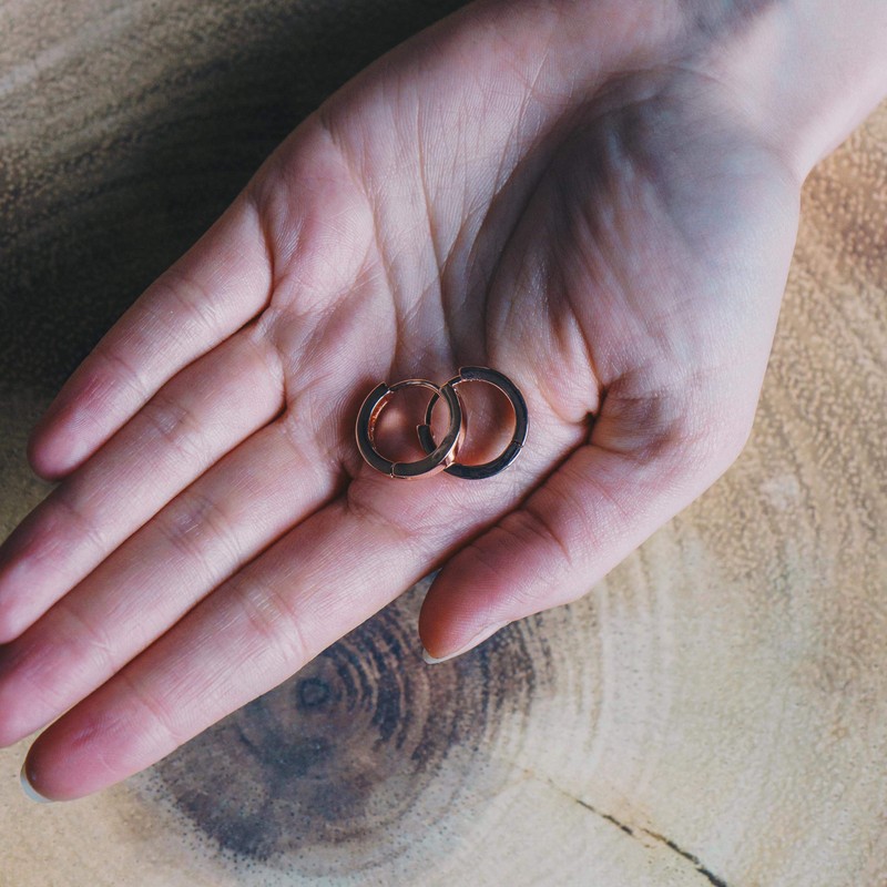 Philip Jones earrings are crafted with a rose gold plating on a brass alloy base, featuring 17mm diameter hoops with a 3mm thickness and huggie closure. Each pair weights 3g.
