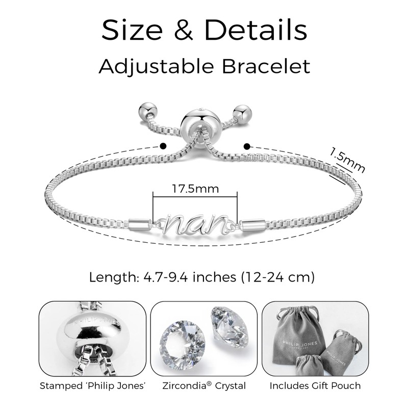 - Made with Trust. Silver Plated Nan Bracelet Created with Zircondia Crystals by Philip Jones. Buy with confidence with our 12-month manufacturer warranty and 30-day money back guarantee if you are not 100% happy with your Bracelet.