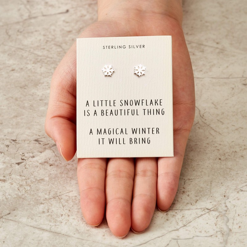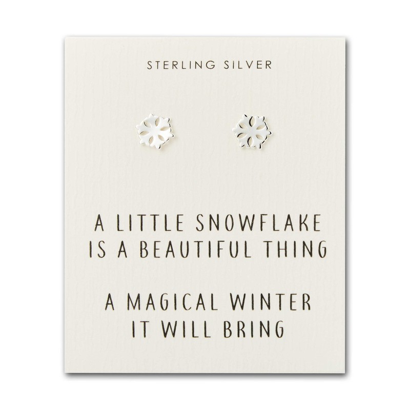 Elevate your holiday look with our Sterling Silver Snowflake Quote Earrings from Philip Jones! Made with hypoallergenic and stamped 925 sterling silver for lasting quality. The delicate snowflake design measures 8.5mm x 8mm and is secured with a butterfly closure. Comes in a festive Christmas pouch with a quote card, perfect for holiday gifting.