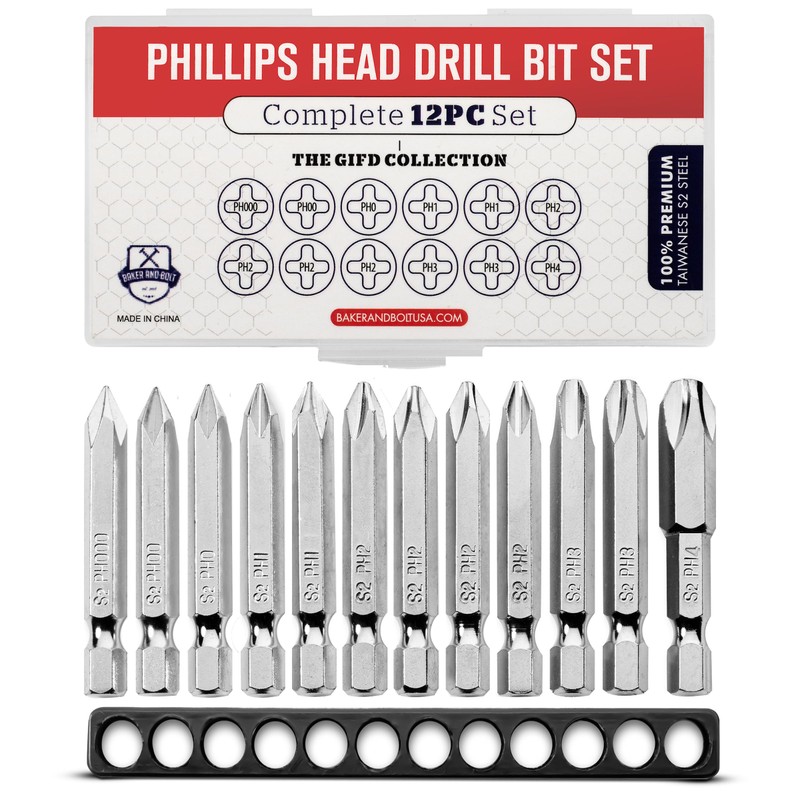 Phillips Screwdriver Drill Bit Set (Premium 12pc Complete Set) w/Storage Case and Bit Holder - 1/4in Hex Shank Magnetic Bit Set - Impact Ready - S2 Steel - Long 2in Heads for Drills. Baker and Bolt