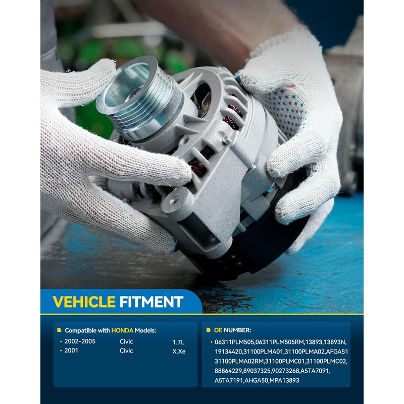 - FITMENT: This Alternator Compatible With 2002-2005 Honda Civic 1.7L L4, 2001 Honda Civic.(Please MATCH your vehicle on the left top before purchasing)