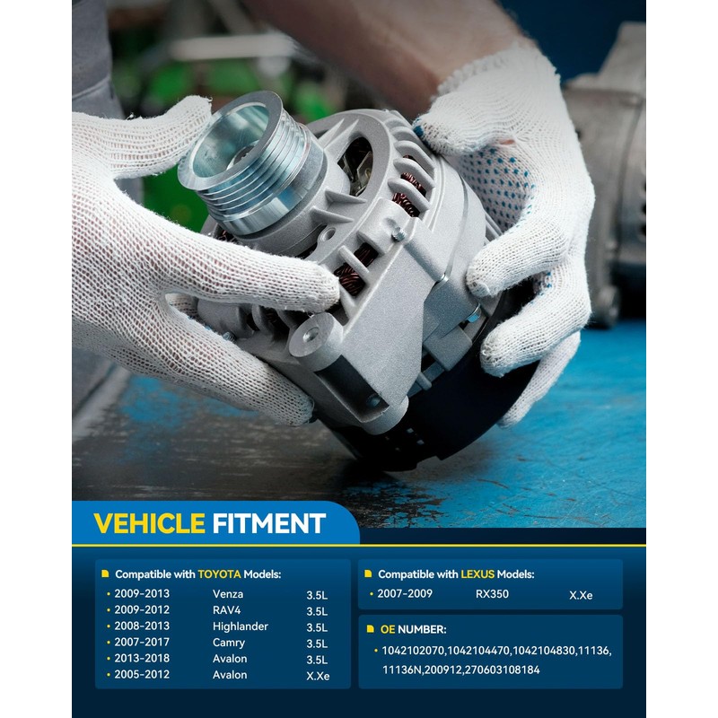 • FITMENT: This Alternator Compatible With 2008-2013 Toyota Highlander 3.5L V6, 2005-2012 Toyota Avalon, 2007-2017 Toyota Camry 3.5L V6, 2013-2018 Toyota Avalon 3.5L V6, 2007-2009 RX350, 2009-2012 Toyota RA-V4 3.5L V6, 2009-2013 Toyota Venza 3.5L V6.(Please MATCH your vehicle on the left top before purchasing)